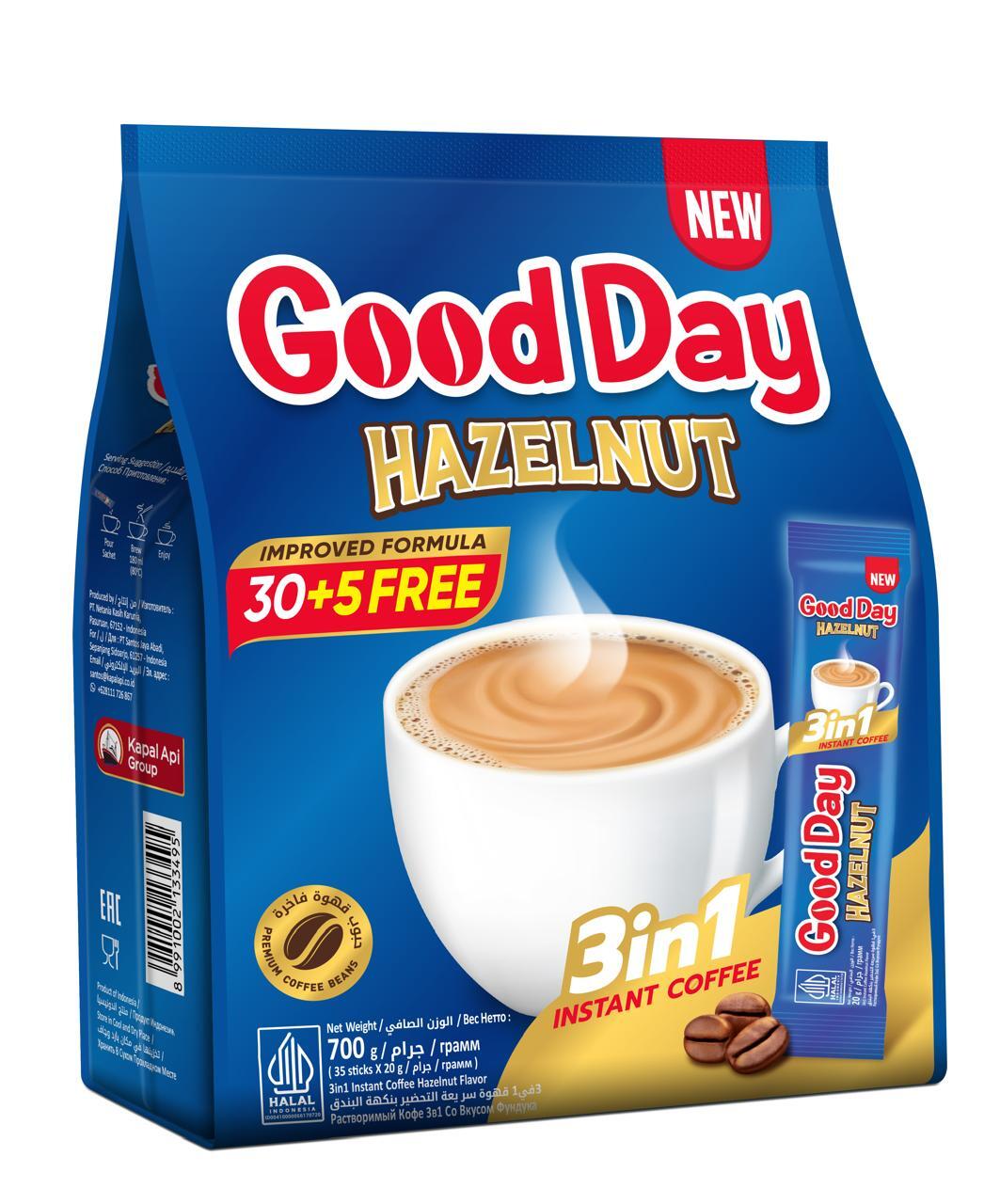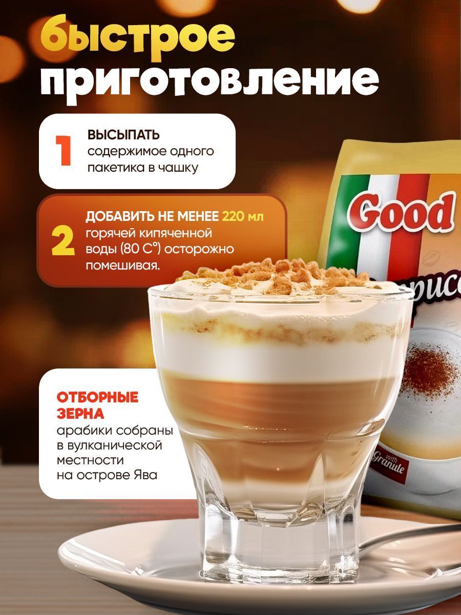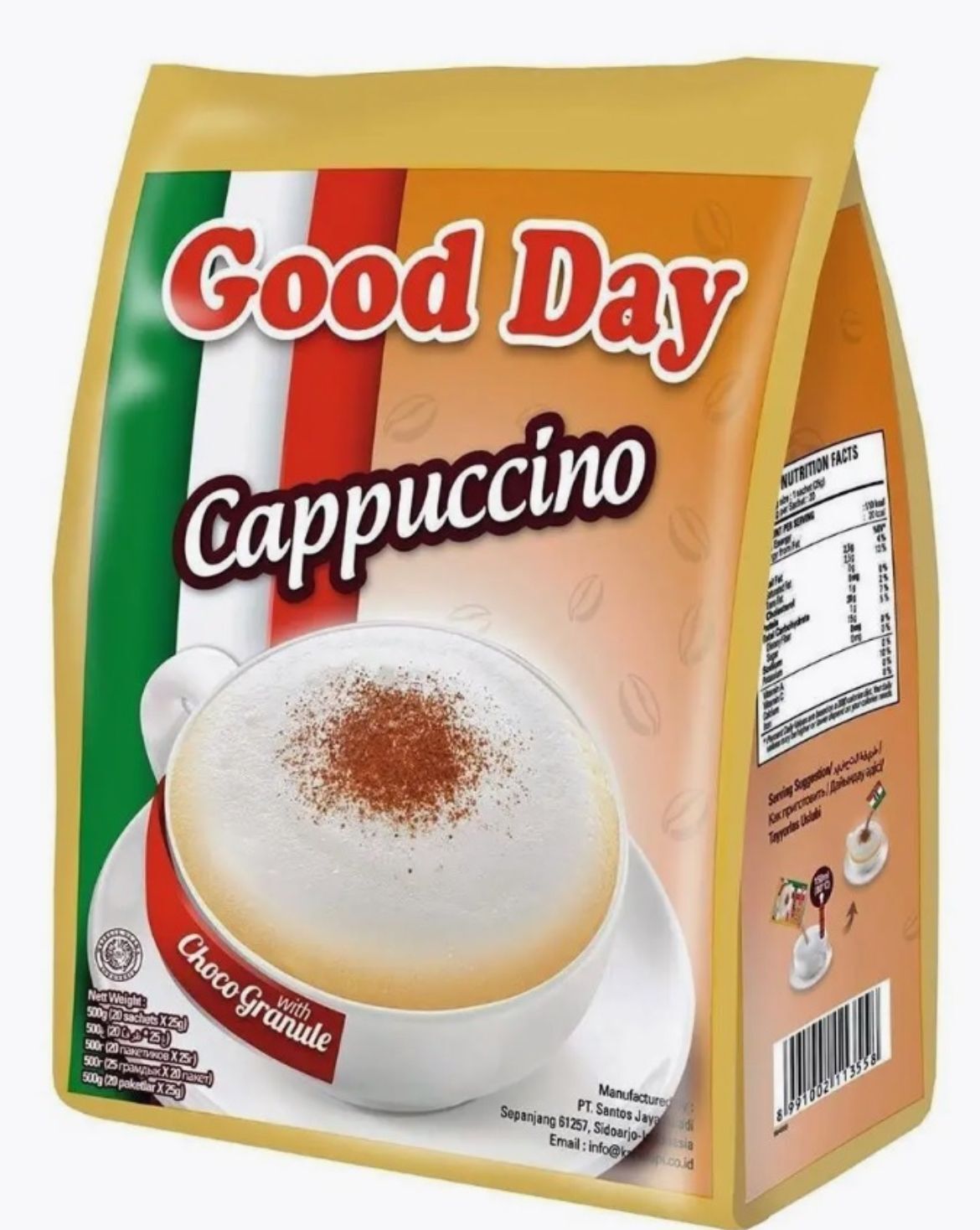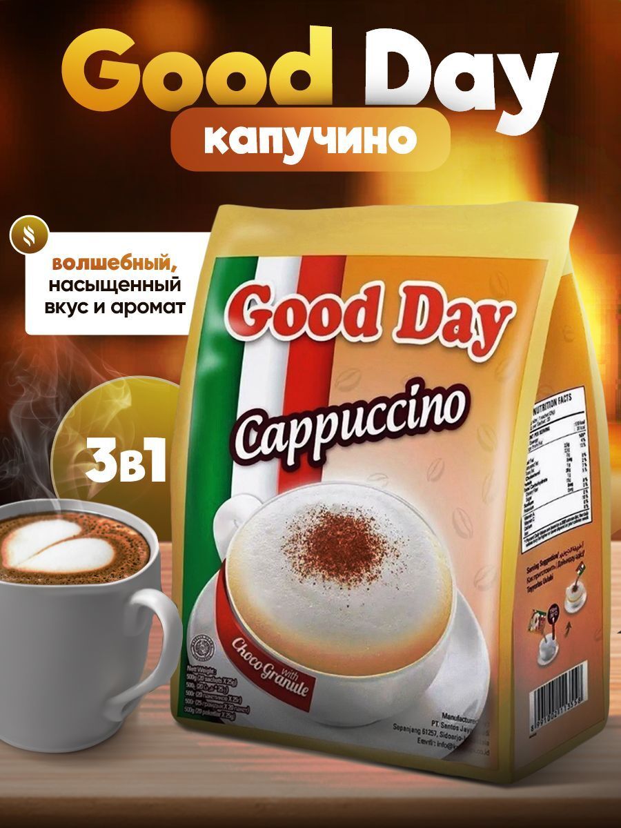 Капучино Good Day производится из отборных вулканических кофейных зерен, выращенных на острове Ява. Напиток обладает роскошной сливочной пенкой, дополненной шоколадной крошкой. Капучино Good Day идеальное сочетание аромата капучино, роскошной пенки и вкуса гранул настоящего бельгийского шоколада.