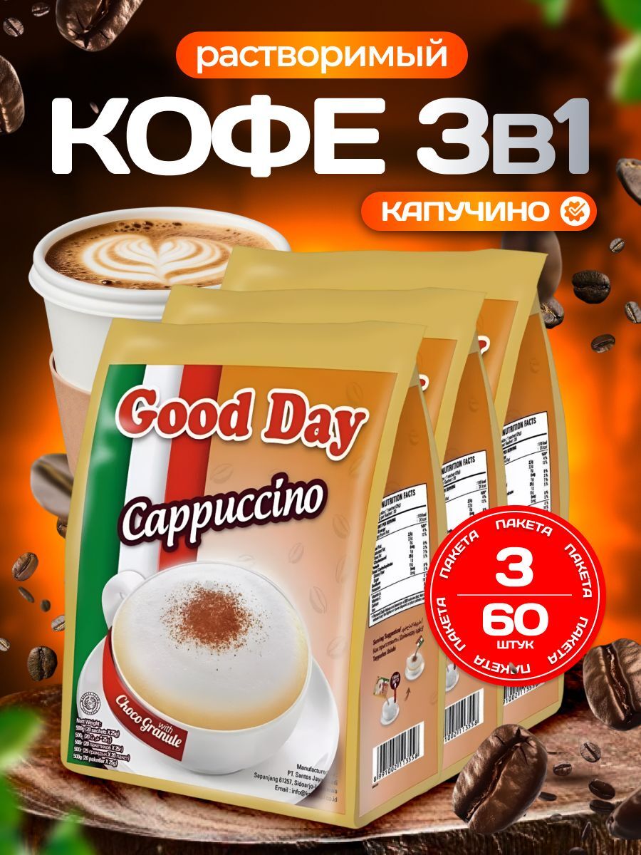 Капучино Good Day производится из отборных вулканических кофейных зерен, выращенных на острове Ява. Напиток обладает роскошной сливочной пенкой, дополненной шоколадной крошкой. Капучино Good Day идеальное сочетание аромата капучино, роскошной пенки и вкуса гранул настоящего бельгийского шоколада.